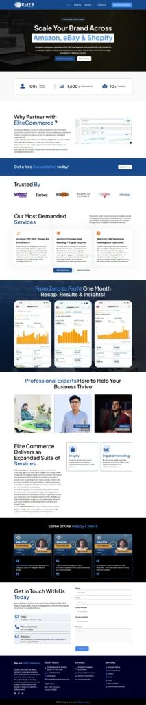 A high-converting eCommerce agency website designed to showcase Amazon, eBay, and Shopify growth services with strong social proof and lead-focused CTAs.